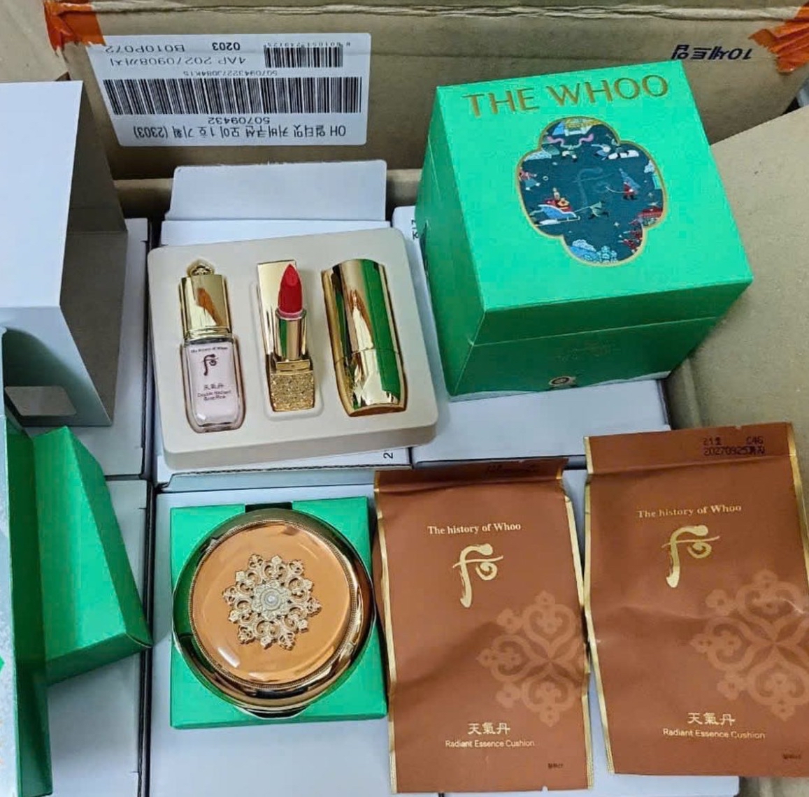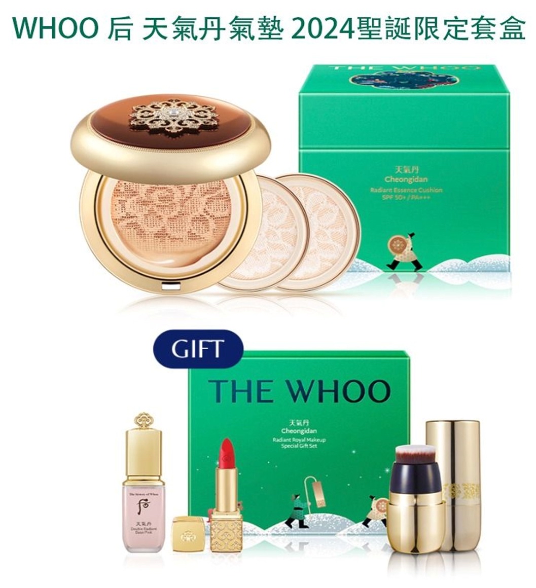 買比老婆/女朋友/閨蜜做聖誕禮物一流🥰 🇰🇷🌲🎅🏽WHOO 后 ✨天氣丹氣墊2024聖誕限定套盒 (連補充裝總共3個) ✅超值套盒包括: 🌸天氣丹 華炫雙層蕾絲氣墊粉底 (SPF50+/PA+++) #21 - 15g 🌸替換裝 15g x2個 🌸天氣丹 華炫粉嫩精華底霜 8ml 🌸拱辰享 美奢華絲絨唇膏 #24橘紅色 1.3g 粉底掃x1 🌲美白、皺紋改善、紫外線隔離功能性化妝品 一款可透過彈力織物的柔嫩低粘度粉底可緊密貼合肌膚。 🌲只需塗抹一次,即可帶來富有彈性光澤的妝感, 是一款高級氣墊。可以保持一整天保持妝容, 並持久保持潤澤的肌理及靚麗的膚色,從而為您帶來氣質美肌。
