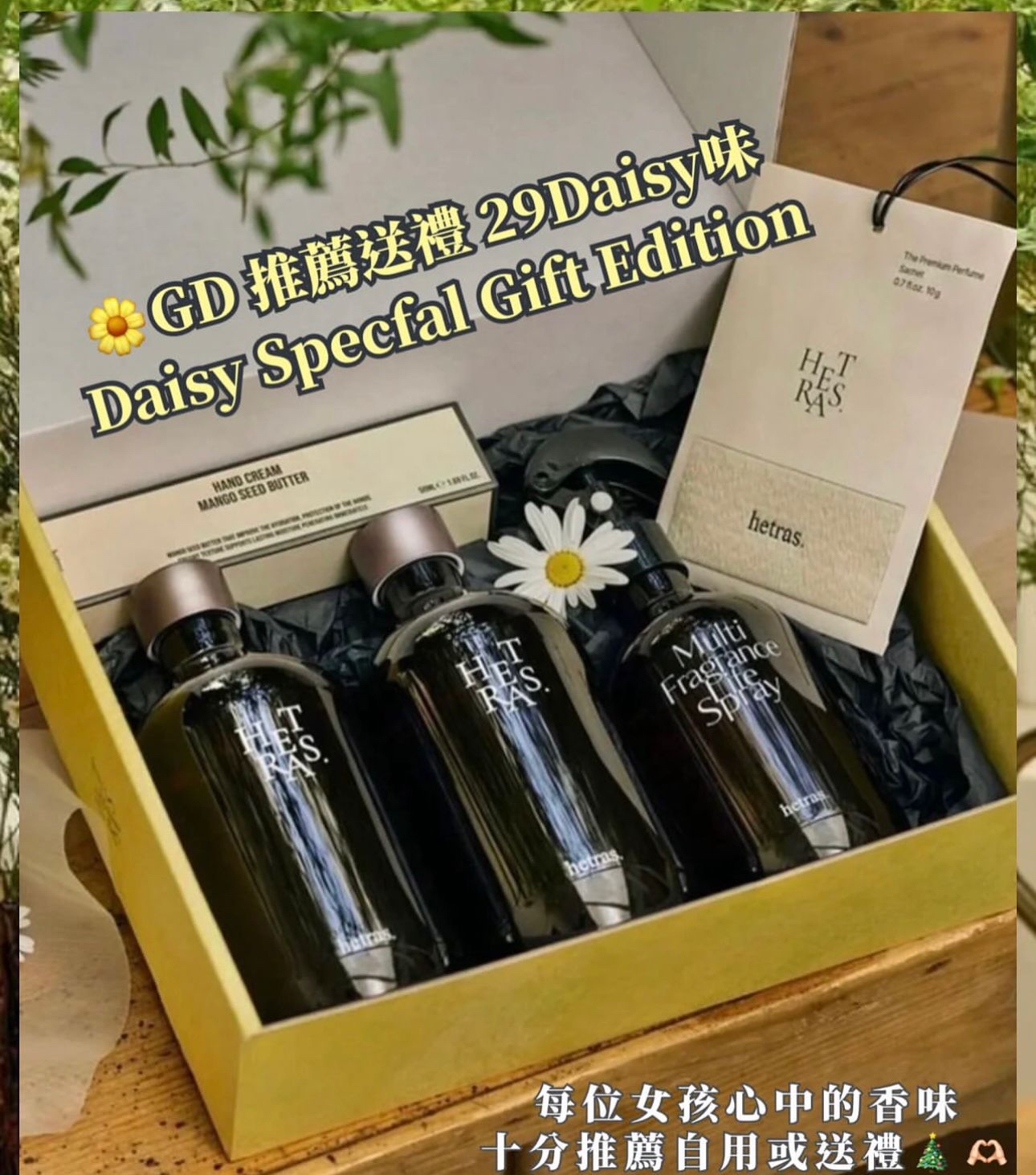GD同款香氛品牌🌼 Hetras Daisy特別香氛禮盒Set 🎁送禮首選💖 ⭐️Daisy 高級擴香瓶500ml*2 ⭐️Dasiy 多用途居室香氛噴霧300ml ⭐️Daisy護手霜50ml ⭐️Daisy香氛香包10g 🌼 禮盒內容 01 高級擴香 由一級調香師匠心調配、香氣層次豐富 輕鬆點亮居家氛圍 02 多用途居室香氛噴霧 適用於衣物、床品、空間、隨心噴灑 03 香氛護手霜 融合加州陽光與柔美氣息、滋潤雙手、留香如同輕抹香水 04 高級香氛香包 適合放置於衣櫃、抽屜、車內、提升生活質感 Daisy香調🌼 清新柔和、像春日早晨漫步在花田 空氣中瀰漫著陽光與花香 前調| 雛菊・橘子・洋甘菊 中調|依蘭・向日葵 後調|雪松・麝香・香草 💛 送禮推薦 無論是生日、節日、喬遷或是犒賞自己都很可以!