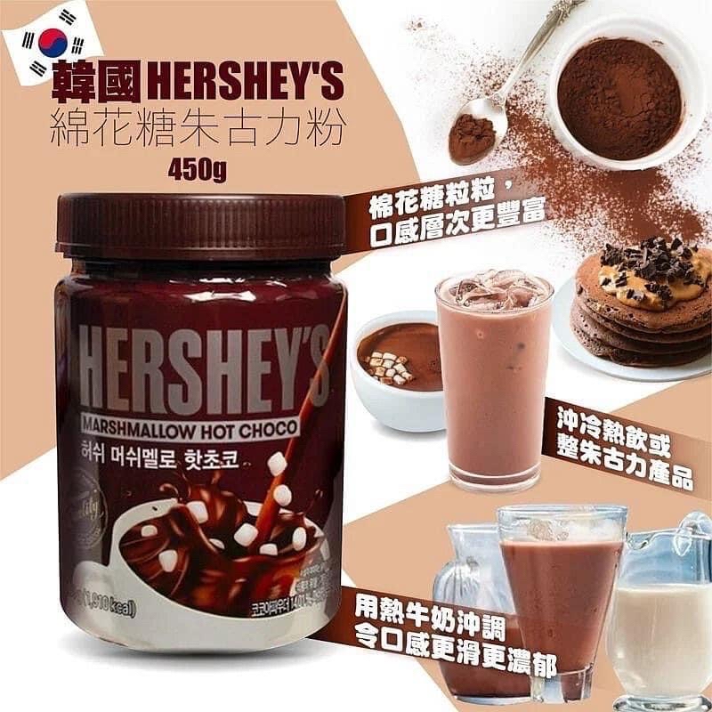 韓國🇰🇷Hershey's 綿花糖朱古力粉450g 經典知名朱古力品牌Hershey’s 推出朱古力🍫粉+棉花糖☁️兩種一次滿足😋不必再花兩次錢買朱古力又買棉花糖! 朱古力名牌Hershey’s響韓國推出既即沖朱古力粉唔止好味😋,濃濃的朱古力粉只要加上熱水就沖到一杯令人身心都暖爆的熱朱古力,夠晒簡單方便!😍唔止可以用黎沖熱飲,仲可以用朱古力粉黎做Pancake🥞,一樣係咁好味! ✅用黎沖熱飲或整 Pancake都一樣OK ✅添加棉花糖粒粒,口感層次更豐富 ✅想口感更滑更濃郁,可以熱牛奶🥛取代清水沖調 ** 產品資料: 名稱:Hershey's 綿花糖朱古力粉 規格:450g 產地:韓國