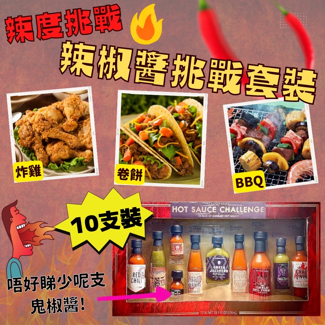 *鐘意食辣既朋友留意🌶️😋一次過可以挑戰10款唔同既辣椒醬🌶️😋* *對自己好有信心既就可以試下全套入面最辣既Brain Killing Ghost Pepper Hot Sauce 呢支係用鬼椒製成🌶️💀💀💀* *係世上數一數二最辣既辣椒😏😏連外國人都食到耳仔痛😱🌶️所以唔好睇少佢呀!😆* 🇺🇸美國進口 辣椒醬挑戰套裝-1套10支 一個平靚正既價錢試曬10款辣椒醬!🌶️🥫 身為食辣既愛好者🌶️😋 餐餐食咩都要有辣先安落👅 無論煎炒煮炸都要加辣先夠味😘😘 呢款辣椒醬挑戰套裝就岩曬你!👏🏻👏🏻 最適合就係加係炸雞、Taco、BBQ等美食🥩🍗🌶️ 即刻令食物變得更惹味😋😋 無辣不歡既朋友仔千其唔好錯過啦🤩🤩 想挑戰既你快啲落單買返套🥳🥳 約買一班食得辣既朋友一齊挑戰😝 睇下邊個撐到最後啦!!!🌶️👏🏻 • Blazin’ Amazin’ Red Chili Hot Sauce • Loco Larry’s Mexican Style Green Sauce • Tongue Scorcher Extreme Red Hot Sauce • Brain Killing Ghost Pepper Hot Sauce • Mango Habanero Hot Sauce • Green Jalapeno Hot Sauce • Habanero Hot Sauce • Garlic Del Fuego Hot Sauce • The Crazy Swine Smoky Bourbon Hot Sauce • Voo Doo Jalapeno 🔆規格:536ml/套 一套10支(4-26ml) ❤️最佳食用日期(Best BY):約2024年2月 以實物為準 💜產品資料: - 美國進口 - 10款不同種類辣椒醬 - 挑戰辣度 - 刺激味蕾