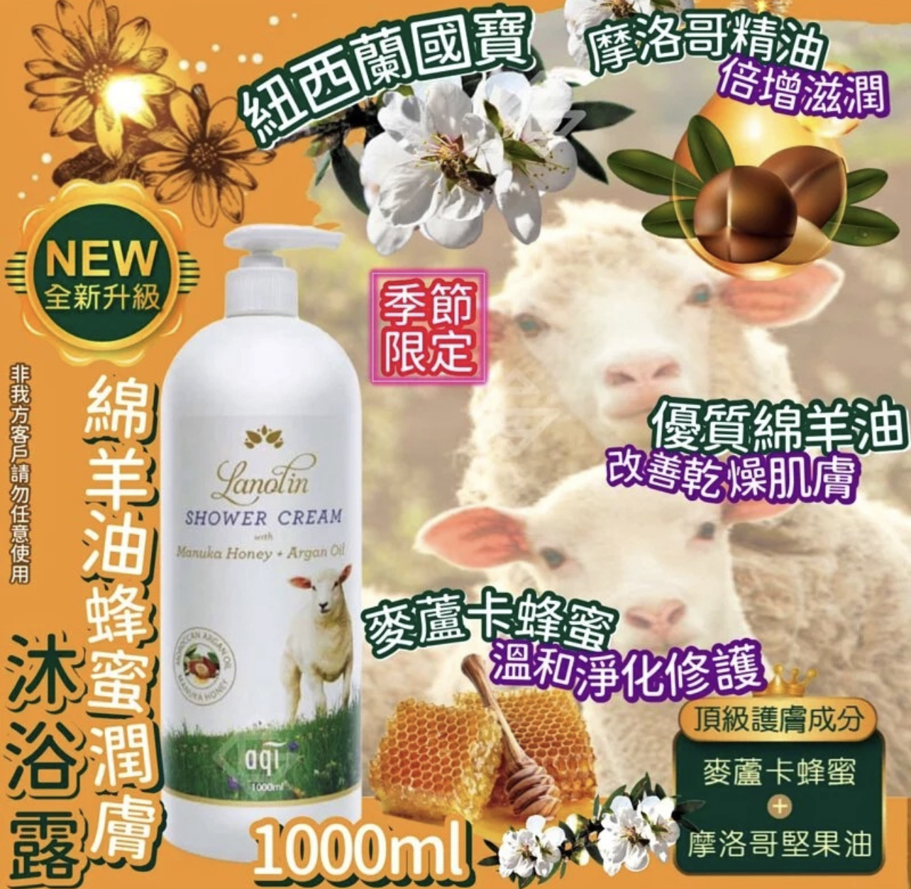 🇦🇺澳洲 AQI 綿羊油蜂蜜潤膚沐浴乳 1000ml 🎉升級版💧滋潤修護 🇦🇺澳洲AQI綿羊油蜂蜜潤膚沐浴乳🛁 添加3種頂級護膚成分🥰享受最好護膚產品 🐑優質綿羊油👉改善乾燥肌膚 🍯麥蘆卡蜂蜜👉溫和淨化修護 🫒摩洛哥堅果油👉倍增滋潤補水 富含植物萃取洗淨成分🌿 🉐 有效改善乾燥肌膚🍂舒緩乾燥皮膚痕癢,幫助溫和清潔肌膚,舒緩因乾燥引起的皮膚癢 為你同家人帶黎一個舒適熱水浴💦 沖完涼又暖又舒服💕 -產地:澳洲 -規格:1000ml -使用期限:製造完成後5年(2026.07) -注意事項: 1.使用時若有不適,請立即以冷水洗淨。 2.皮膚若有傷口、發炎、濕疹…等異常現象時,請勿使用