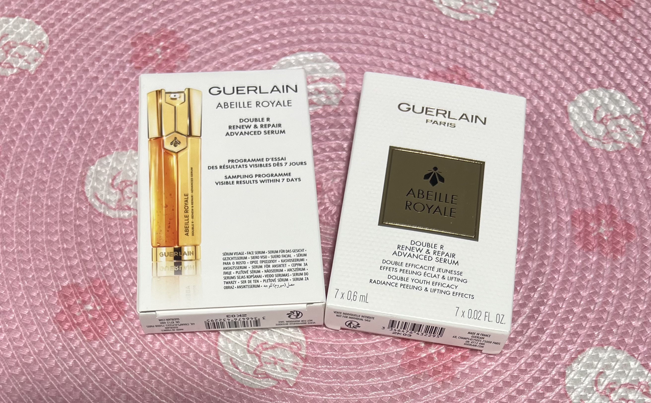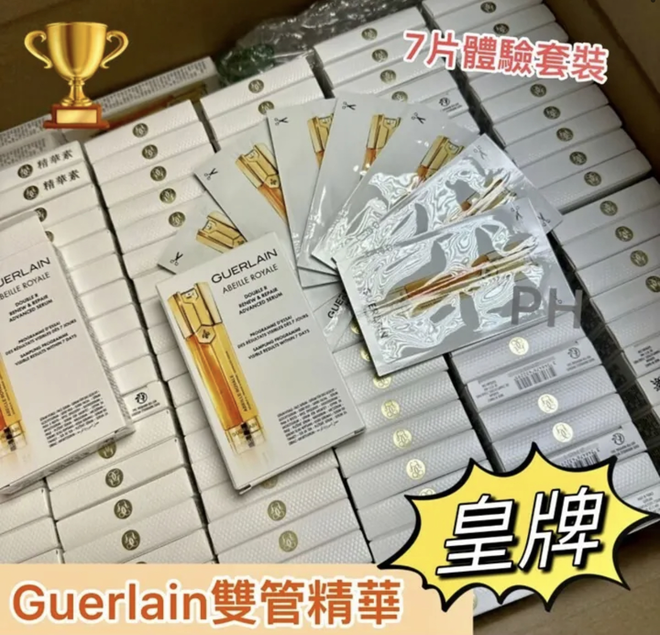 🌸 GUERLAIN 嬌蘭升級版再生修護雙效精華精華7片*0.6ml裝(盒裝) 強烈推薦你們的嬌蘭雙萃精華👏🏻👏🏻 味道是很好聞的蜂蜜,又帶點花香。不油膩,很好吸收。🥰 混油皮也毫無壓力。左邊清理皮膚老廢角質,加速細胞更新。右邊黑蜂王漿精粹,可以讓毛孔更為緊致,修復肌膚的彈力。 EXP : 2025/10