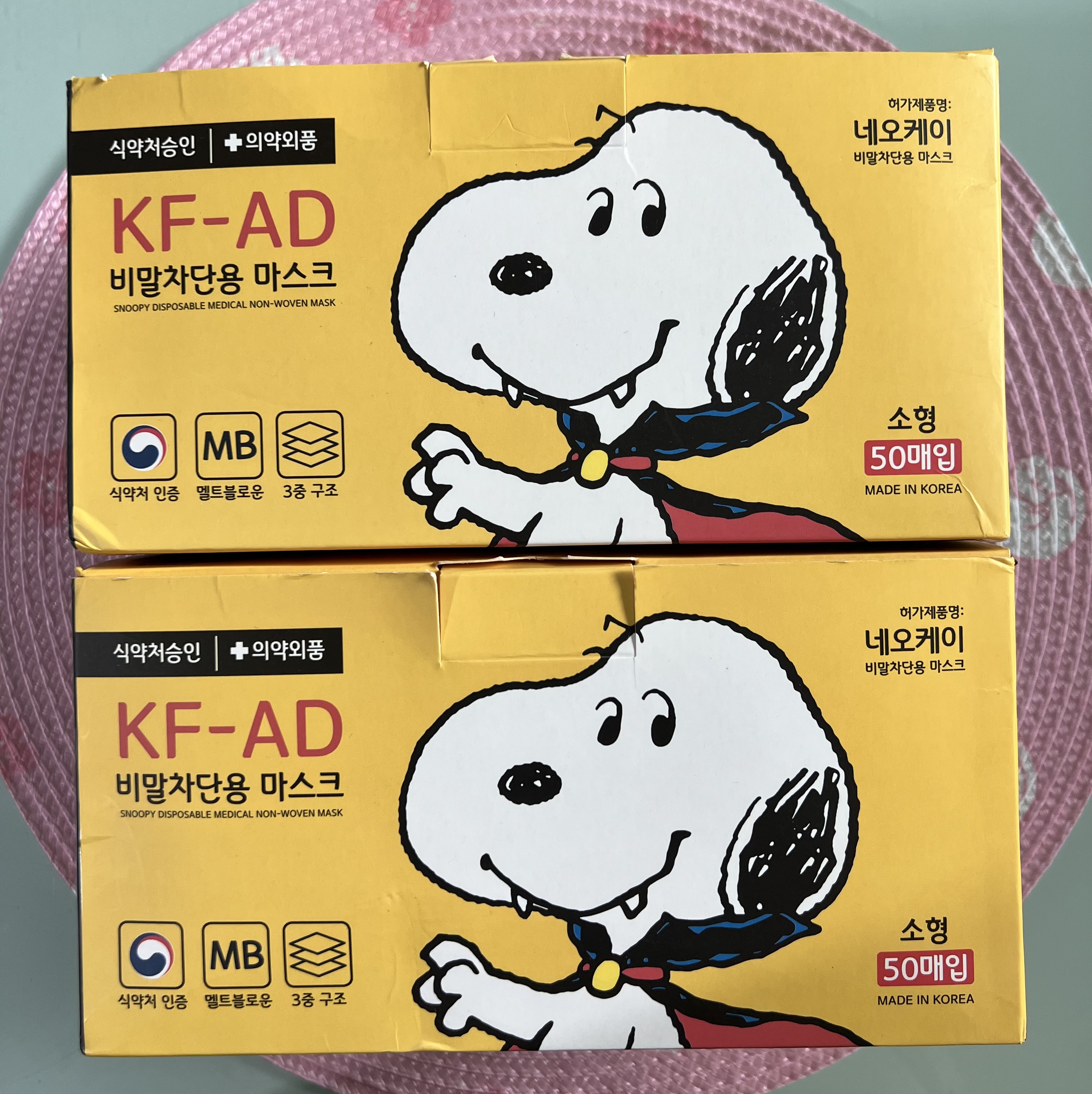 🇰🇷韓國製造Snoopy KFAD三層中童平面口罩(1盒50片) 岩哂夏天使用😍 Snoopy正版授權 x 韓國製KFAD印花口罩 白色口罩配上右下角Snoopy大頭印象,低調又有趣! ✅ 韓國製造 #韓國直送 ✅ 韓國食藥局發出KFAD及醫藥外品證明 中童尺寸:15 x 9.5cm (適合4-11歲小童使用,12-13歲細臉中童亦可)(黃盒包裝) -規格:一盒50個 -產地:韓國 Exp date : 5/2024