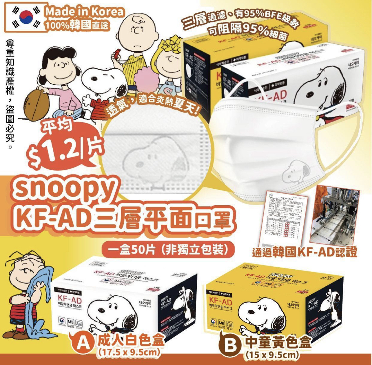 💟現貨💟 🇰🇷韓國製造Snoopy KFAD三層中童平面口罩(1盒50片)