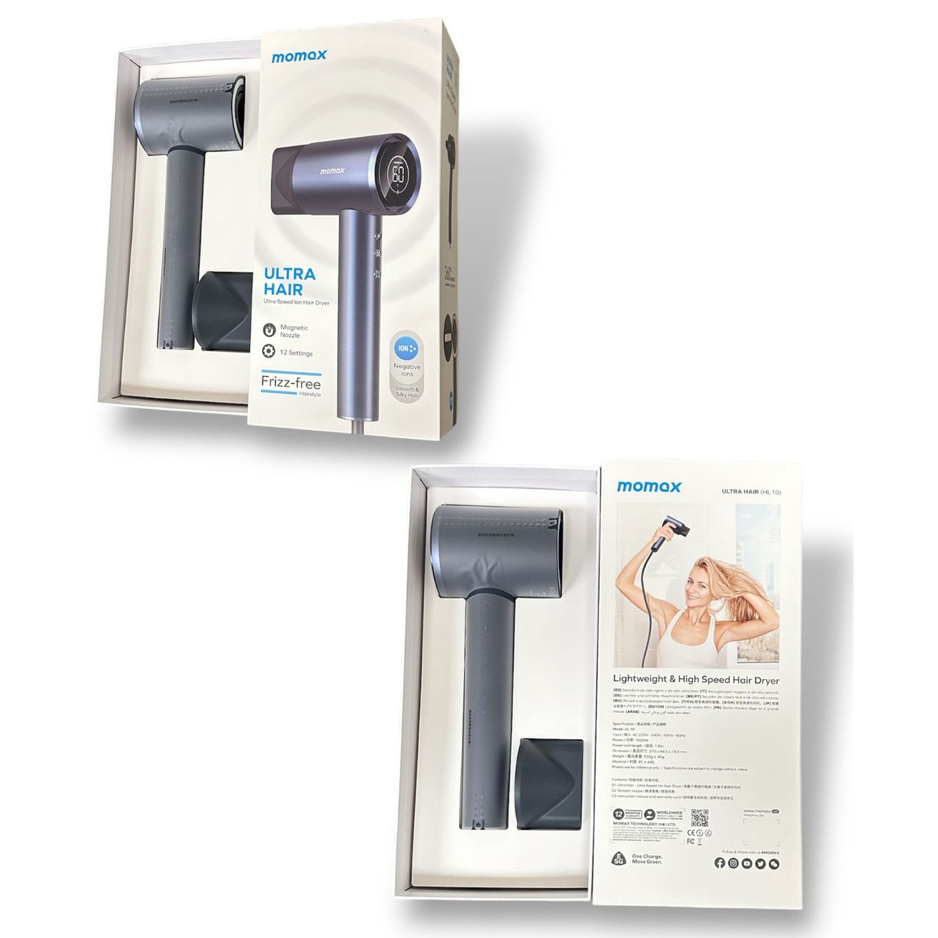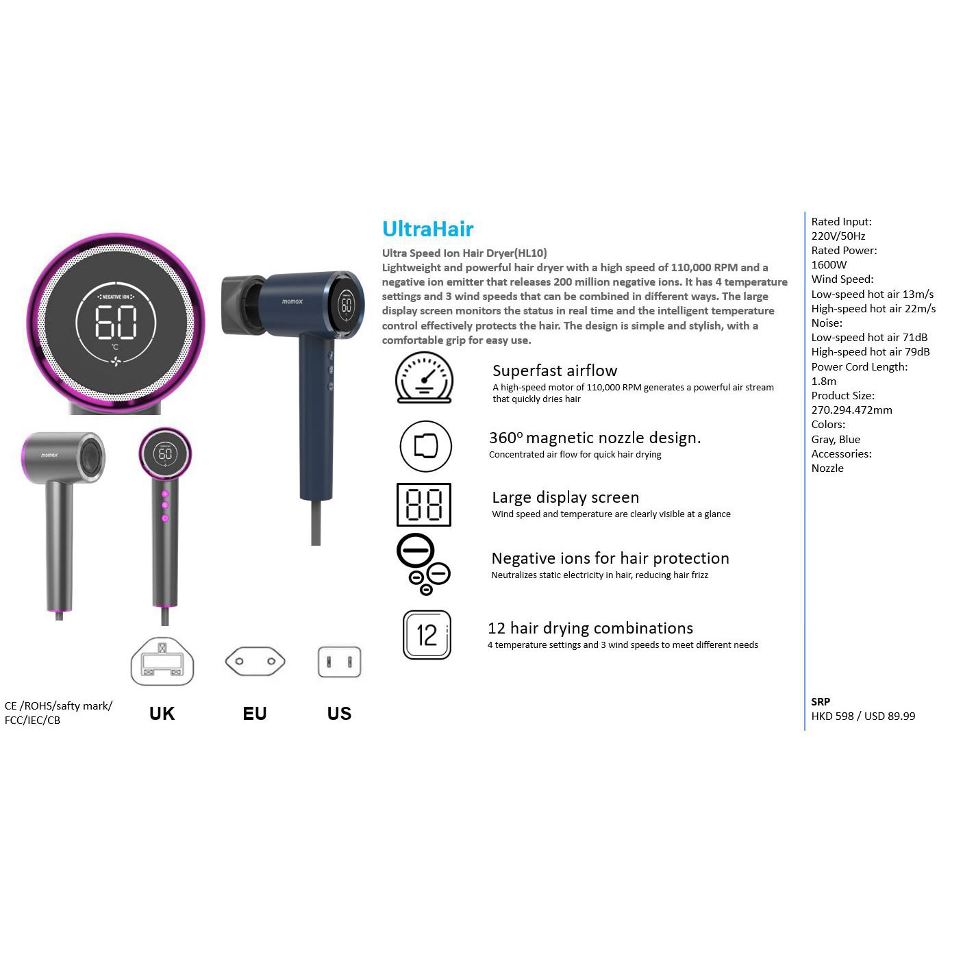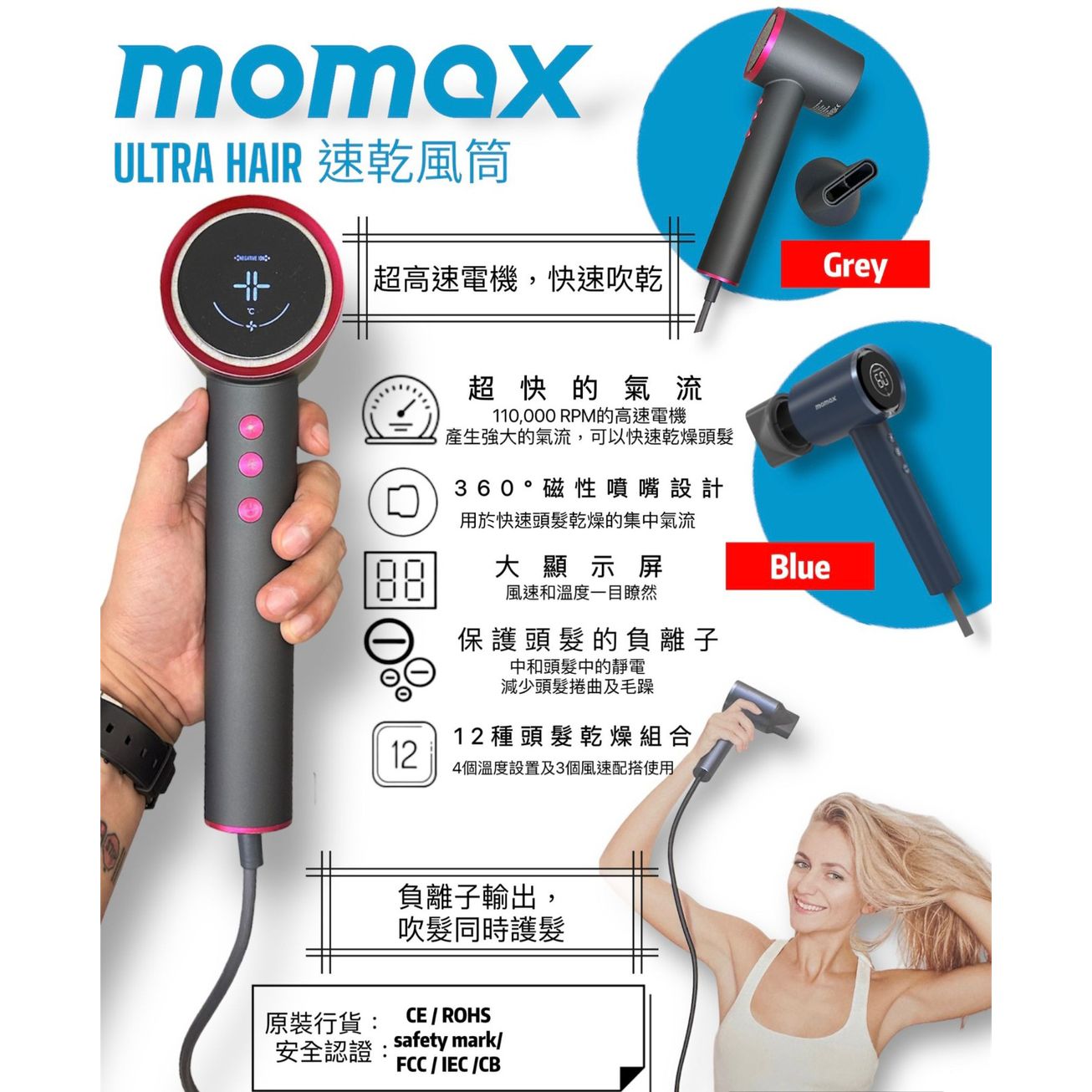 🥳🥳Momax 新品預購👏👏 Momax 今次新推出嘅呢款風筒真係好勁 27/8截🟡Momax HL10 風筒🟡(約9月底到港) ✨兩色可選✨ 🅰️Gray 🅱️Blue 香港行貨一年保養 💡佢既超高速摩打 :達到110,000RPM 出風好有力,吹出黎既風感覺好厚實,面積好廣又舒服~ 💡配搭埋2億負離子既功能,快速乾髮既同時抵消靜電,頭髮會無甘乾同埋髮尾會少左好多毛躁開叉。 💡智慧溫度控制有效保護頭髮。 💡磁吸造型集風嘴,輕巧僅重450g 方便使用。 4️⃣種溫度及3️⃣種風速,簡單易用 ✔️有自動清潔入風口功能 ✔️倒吹啲番灰塵出黎 証書齊全,用家安心使用 : CE /ROHS/safty mark/FCC/IEC/CB 功率 : 1600W 低速熱風 : 13m/s 高速熱風 : 22m/s 噪音:低速熱風 71dB 高速熱風 : 79dB 線長 : 1.8m 配件 : 噴嘴 產品尺寸 : 270 x 294.4 x 72mm ==⚠️ 聲明 ⚠️== 所有帖文內容只作分享及參考用途。為免混淆視聽,所有商標或版權均屬有關商品品牌商標的持有人,敬請留意