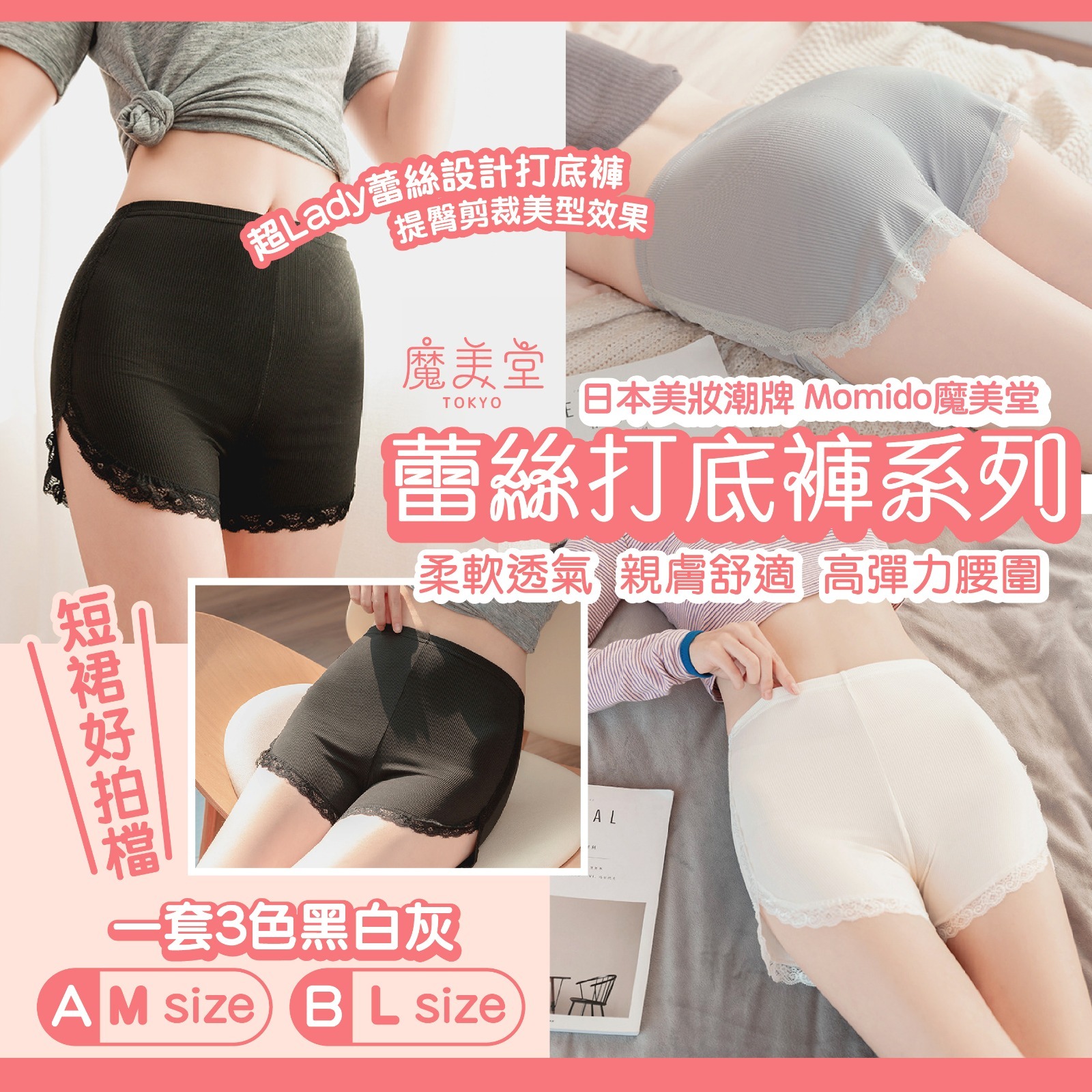 15/4截🇯🇵日本Momido魔美堂 蕾絲打底褲套裝 一盒有3 條(黑白灰 每色各一條) (約6月中到港) 🤫靚靚秘密法寶🤫 做精緻靚靚要有内而外散發! 除左護膚美肌之外...仲有咩要注意 隱藏係視綫之下~秘密法寶 ⭐蕾絲打底褲系列⭐ 夏天為大地帶來美腿🦵🏼短裙出動 當然唔少得短裙好拍檔打底褲‼️ 大熱新款🔥日韓熱賣蕾絲打底褲 超Lady彈力螺紋蕾絲設計打底褲系列💕 内搭一樣精緻🥰露出同樣時尚 係屋企當睡褲短褲著都無問題✅ 舒適褲仔包覆感👍🏼著裙安心感 高彈力腰圍⭕舒適唔勒住條腰 提臀剪裁美型效果😍打底小心機 柔軟透氣🌬️悶熱時節穿著無問題 親膚舒適物料💕減少敏感發生 🔻尺碼選擇🔻 (人手平量,誤差約1-3cm,介意誤差人士慎購) 🔹A. M size 22-28吋腰圍;建議約40-60kg人士適用;褲長30cm 🔹B. L size 27-32吋腰圍;建議約60-70kg人士適用;褲長30cm 夏天必備小褲仔☀️内搭外穿都可以 超精緻蕾絲設計款式👀矚目熱賣中 彈性超舒服💯不斷郁動都無問題 *※圖片顏色僅供參考,因電腦螢幕或拍攝燈光差異而存有色差,一切以實物為準!本司不接受因顏色問題而退換貨,介意者慎購!* 廠商有權更換產品包裝而不作另行通知;運輸過程中,包裝外盒會有機會因碰撞而造成輕微損毀凹陷; 然而包裝外觀等並不影響其內容物之品質及使用,因此恕本司未能因包裝外觀等各種因素作任何退換,介意者慎購!