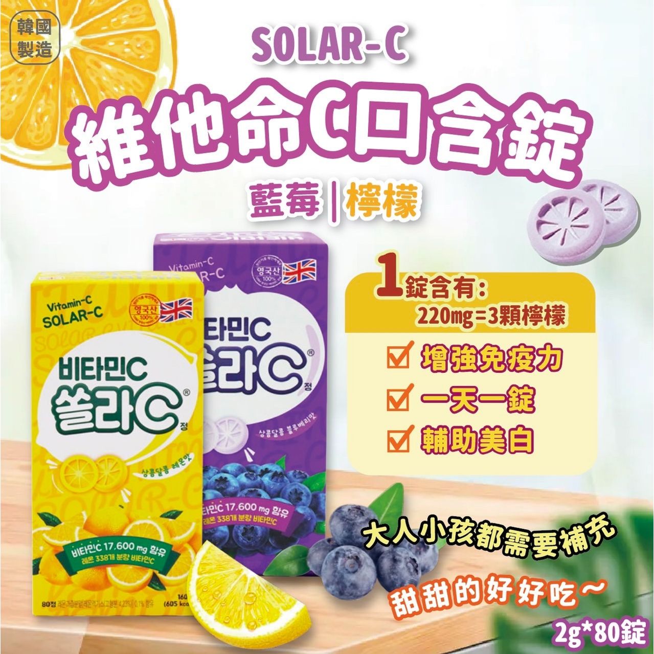 25/4截 韓國製造🇰🇷 SOLAR-C 維他命C口含錠 (2g x 80錠) 藍莓/檸檬 (約5月底到港)
