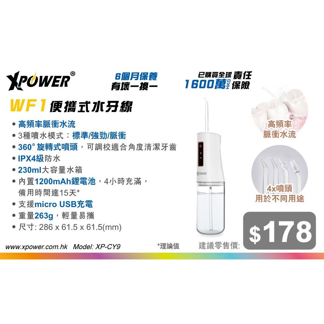*🆕新品推介🆕* 想有清新口氣😮💨XPower WF1 便攜式水牙線幫倒你😘 26/8截🟡XPower WF1 便攜式水牙線🟡(約9月中到貨) *✅香港原裝行貨,6個月保養* ✔️IPX4 防水規格 ✔️高頻率脈衝水流 ✔️3種噴水模式,標準、強勁、脈衝 ✔️230ml 大容量水箱 ✔️內附4個噴頭,不同用途使用 ✔️來電1200mAh鋰電池,備用時間達十五天 ✔️支援 Micro USB 充電 ✔️僅重 263g ✔️已購買全球 1600責任保險 產品尺寸:286*61.5*61.5mm