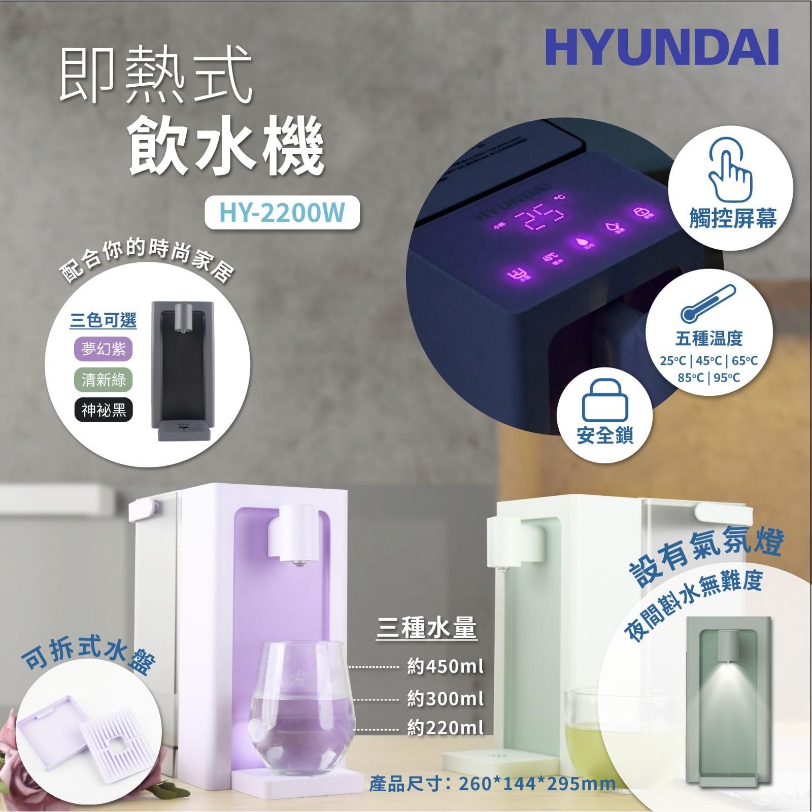🇰🇷韓國Hyundai 即熱式飲水機 HY-2200W ✨ 3種顏色可選✨ A. 夢幻紫 B. 清新綠 C. 神秘黑 💟一年保養💟 ❌原價$599❌ 🇰🇷SEOUL EC 代購優惠💵HKD 499/部 ✔️3L 大容量水箱 足夠全家人飲用👨👨👦👦 ✔️只需3秒迅速加熱 🔥 熱水隨時準備好 ✔️提供5種溫度選擇 25/45/55/85/100°C 😘 ✔️3種出水量💦,大/中/小杯 ✔️輕鬆沖咖啡☕、茶 或者煮杯麵 ✔️配備獨立安全鎖 防止小朋友誤觸👍 ✔️機身設有氣氛燈 😙 夜晚斟水容易對準出水位 ✔️咁好睇又好用嘅飲水機 大家屋企當然要有😻 產品特色: ❤3秒出水、5種溫度選擇 🔒獨立安全鎖 👏3L大容量水箱 💡設有氣氛燈 產品規格 型號: HY-2200W 尺寸: 295 x 144 x 260 mm 重量: 1.5 KG 額定電壓: 220V 額定功率: 2200W 額定頻率: 50Hz ===========⚠️ 聲明 ⚠️============= 所有帖文內容只作分享及參考用途。為免混淆視聽,所有商標或版權均屬有關商品品牌商標的持有人,敬請留意。