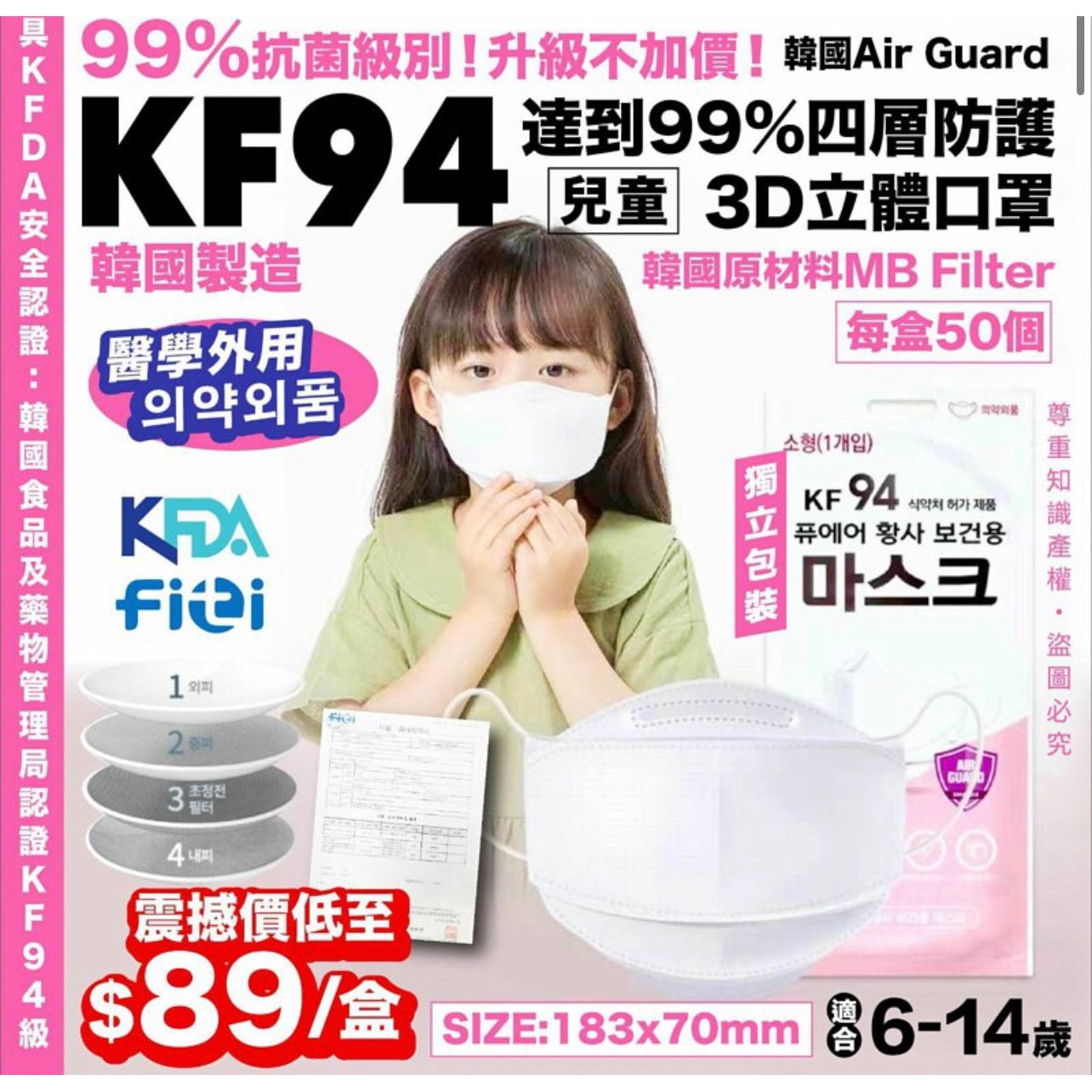 預訂🇰🇷韓國Air Guard 兒童KF94達到99%四層防護3D立體口罩-1盒50個